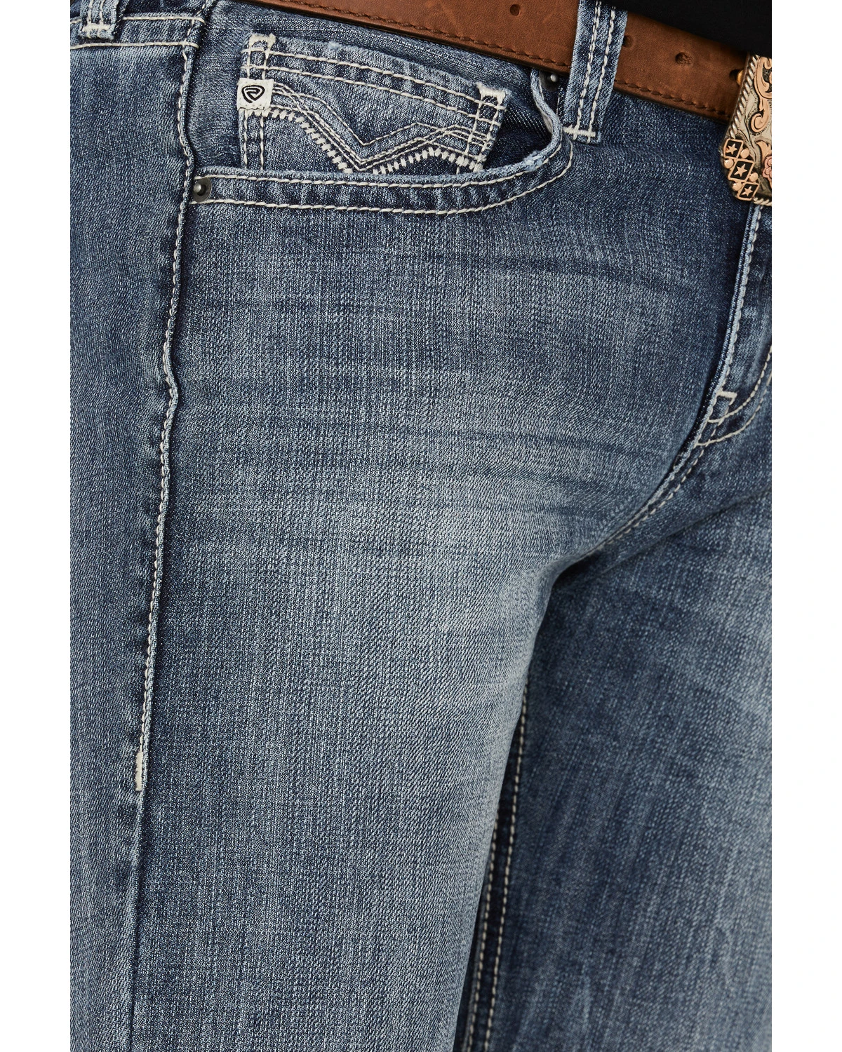 - Heavy “V” stitching on back pockets